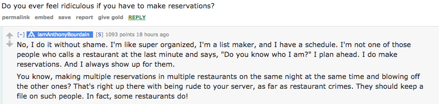 Other notes of interest within the nearly 10,000 comments that crammed the string before Bourdain ran out of time and whiskey: